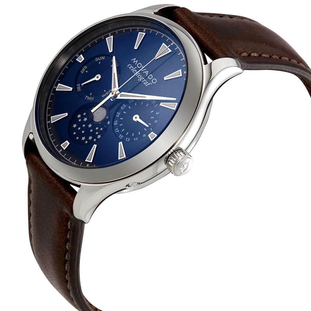 Movado 3650009 women’s Heritage navy blue dial brown strap watch is offered, in a polished solid stainless steel case. This model is made in dimensions of 36mm across and 10mm high. This watch has a fixed bezel and a textured push/pull main crown. Movado 3650009 is fitted with a stitched brown genuine leather strap. Securing the strap is a pin buckle clasp made in stainless steel.